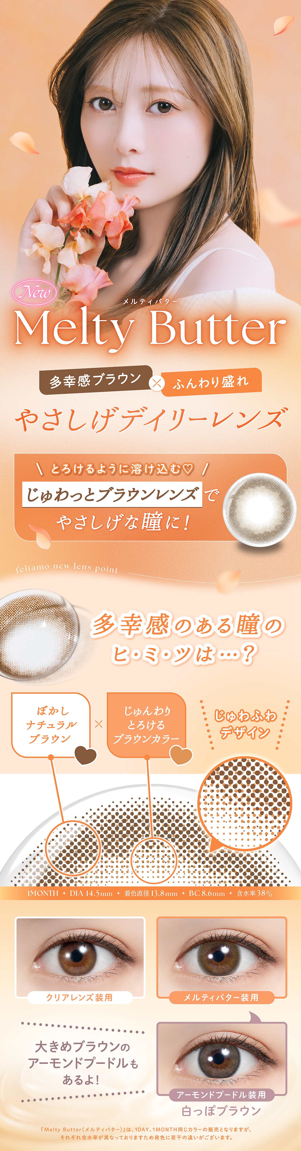 ふんわりしたレンズデザインとやさしいダークブラウンがとろけるような甘い瞳を演出。