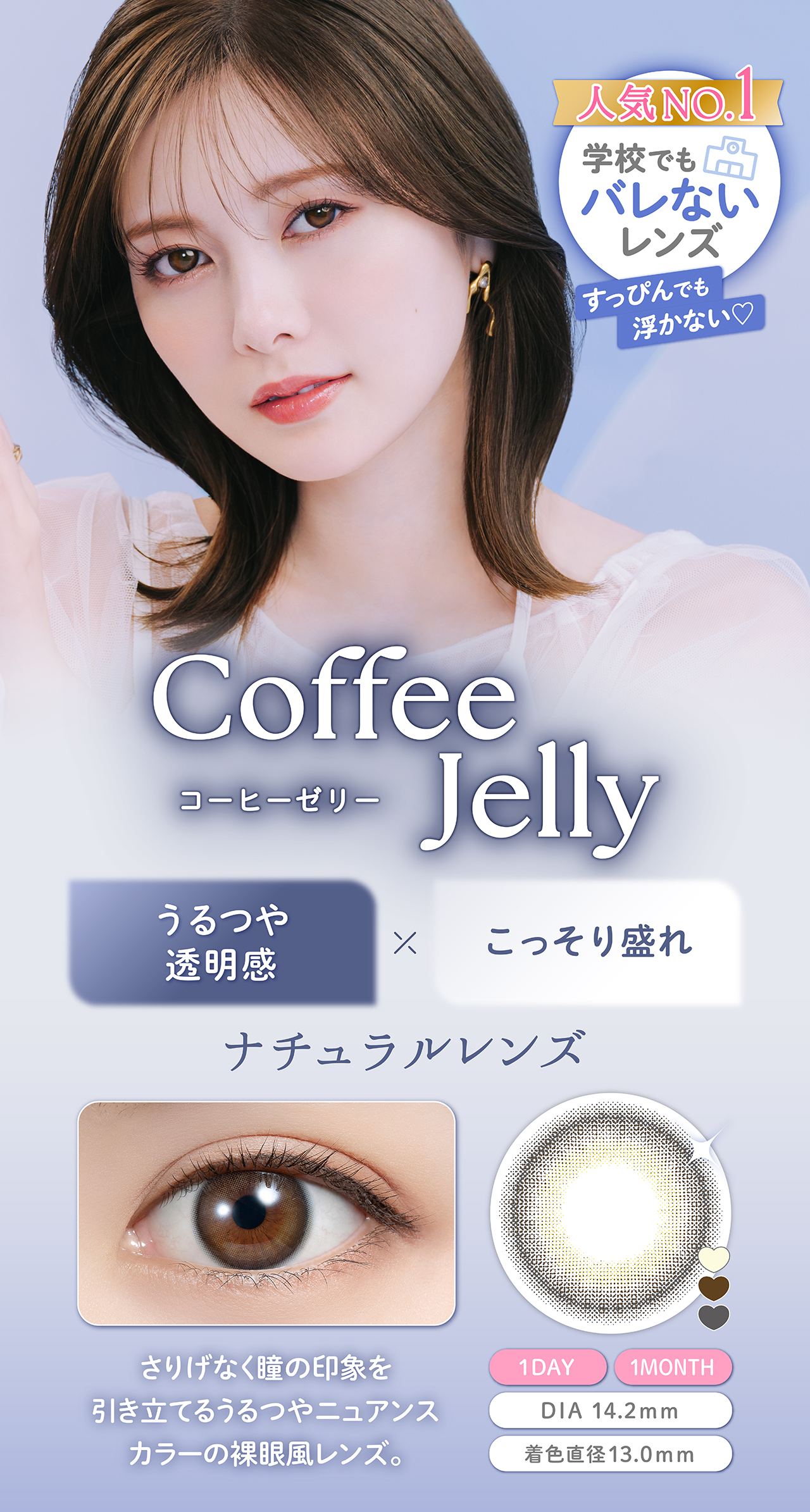 さりげなく瞳の印象を引き立てる、うるつやニュアンスカラーの裸眼風レンズ。