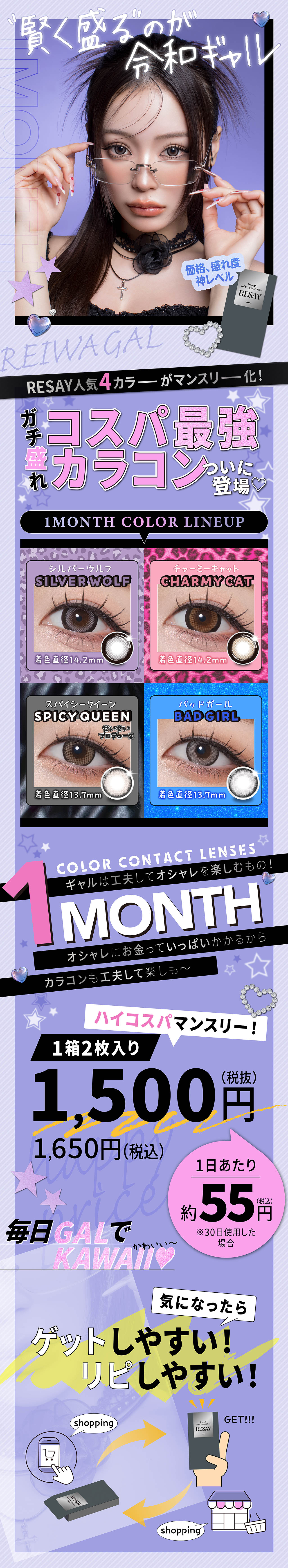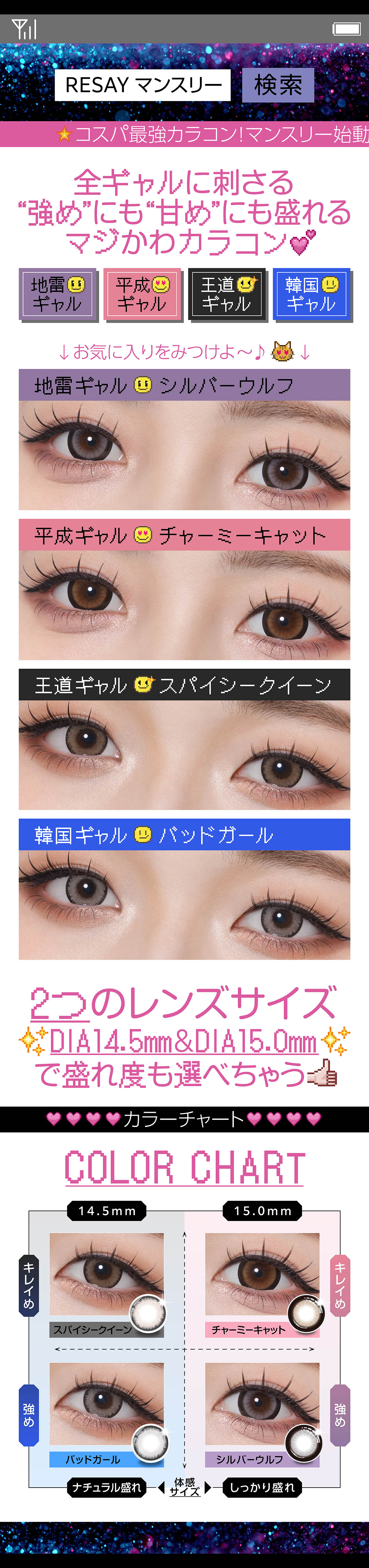 RESAYより1day人気カラーの4色が賢く選ぶギャルのためのマンスリーレンズとして登場!